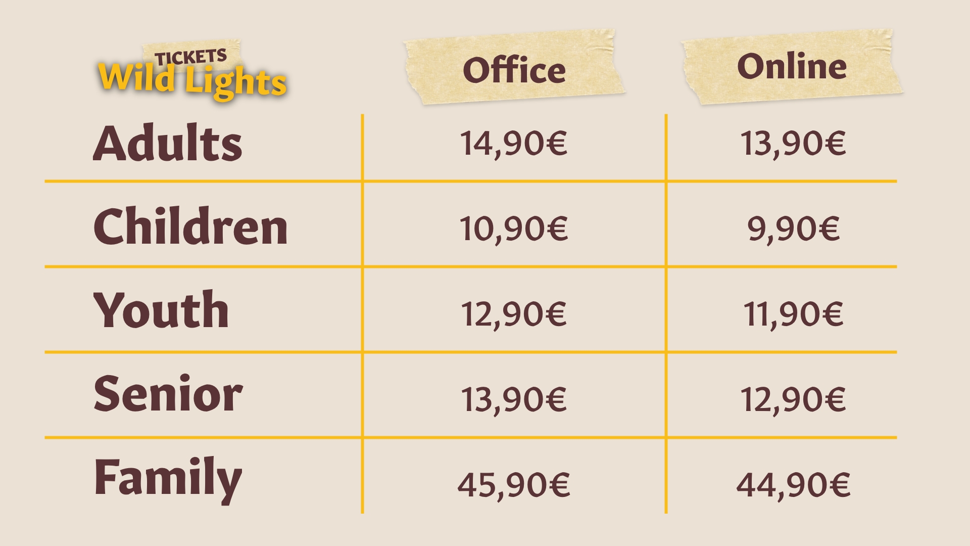 During this period, the Zoo offers two types of visits: Full visit to the Zoo + light exhibition – those who purchase a Zoo ticket have free access to Wild Lights on the days when the exhibition is held.